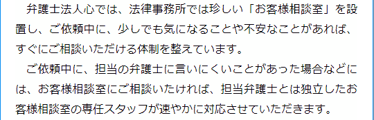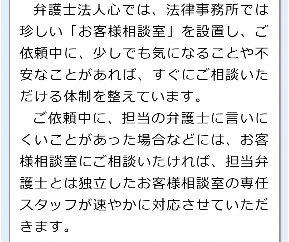 当法人では、担当とは独立した機関としてお客様相談室を設け、より良いサービスを提供できるよう努めています。お客様相談室についてはこちらをご覧ください。