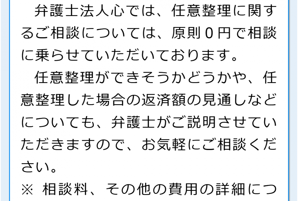 また、当法人では借金問題について原則として相談料無料で対応しておりますので、任意整理をお考えの方は、当法人まで、まずはご相談ください。