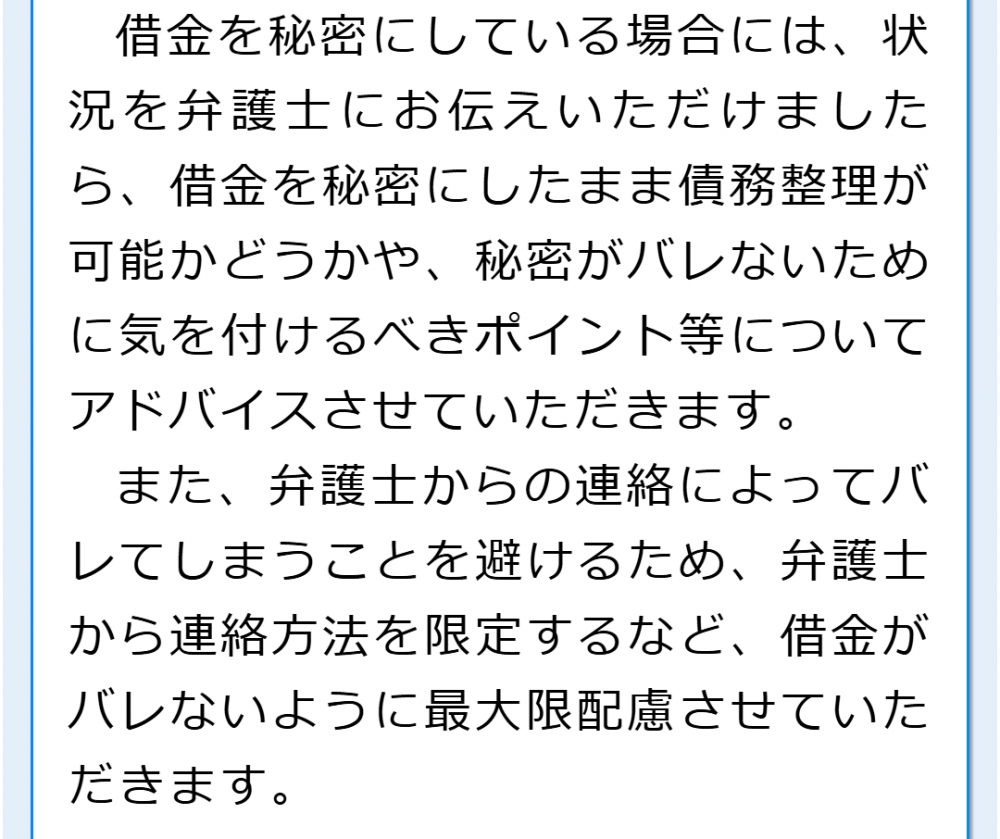 借金について、家族や保証人に迷惑をかけたくない、勤め先に知られたくない等のご希望がある方も多いかと思いますが、任意整理であれば、相手を選んでの交渉が可能ですので、そのようなご希望にも対応できる可能性があります。